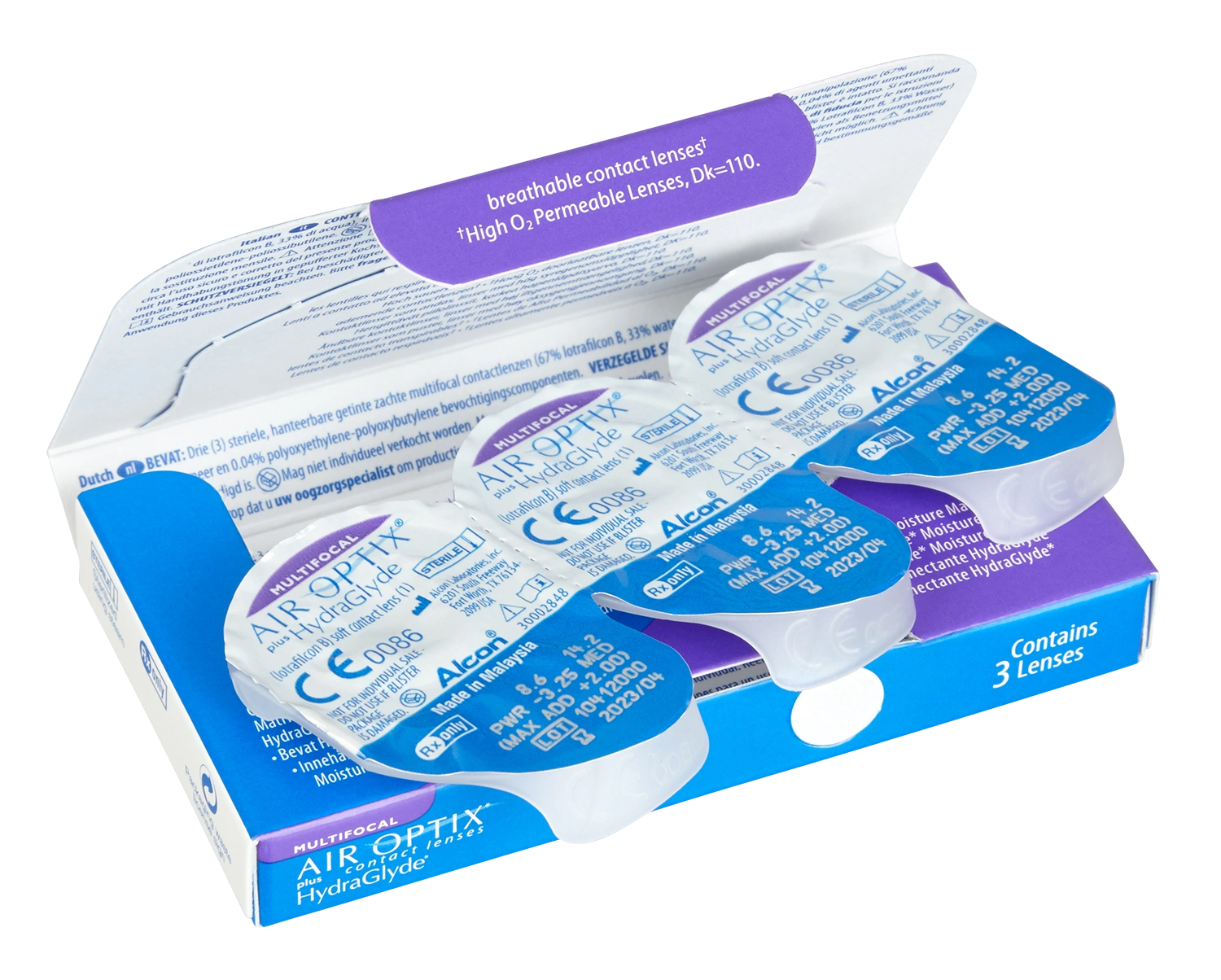 Air Optix plus HydraGlyde® Multifocal-Kontaktlinsen des führenden Herstellers Alcon sind Monatslinsen, die eine neue fortschrittliche Technologie für ein äußerst angenehmes Tragegefühl verwenden. Die HydraGlyde® Moisture Matrix hilft der Linsenoberfläche, Wasser mit einer dünnen, schützenden Feuchtigkeitsschicht zu speichern. Dies versorgt die Augen den ganzen Tag über mit Feuchtigkeit und macht sie zu einer der besten Linsen bei trockenen Augen und beim Sport.